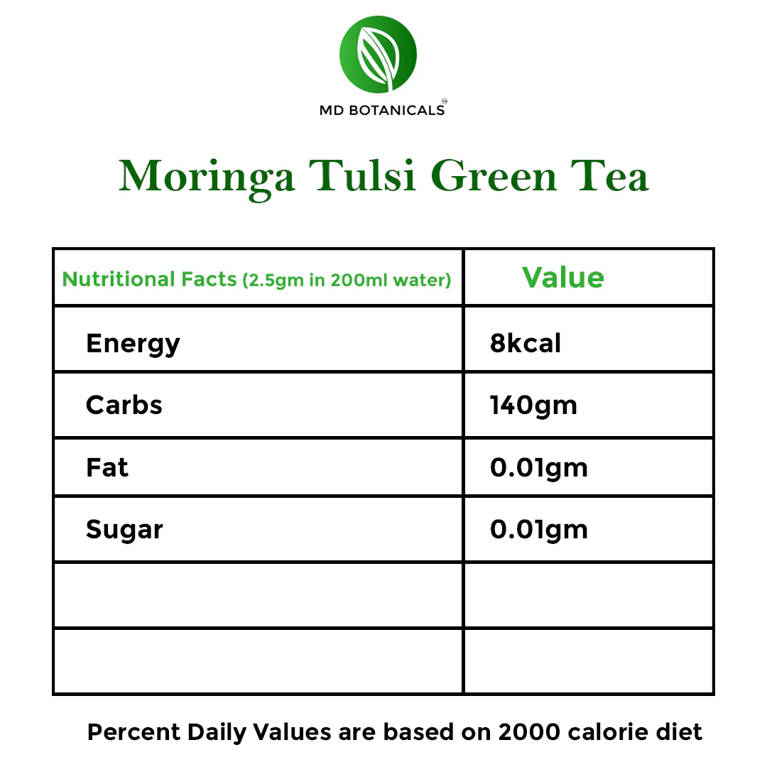 Moringa is a potent antioxidant, anti-inflammatory, rich source of plant-based protein, supports gut health, promotes bone health, it is a solution for iron deficiency. Tulsi and Black pepper helps in boosting immunity, they have anti cancerous properties, helps in reducing stress and blood pressure and are good for heart health.