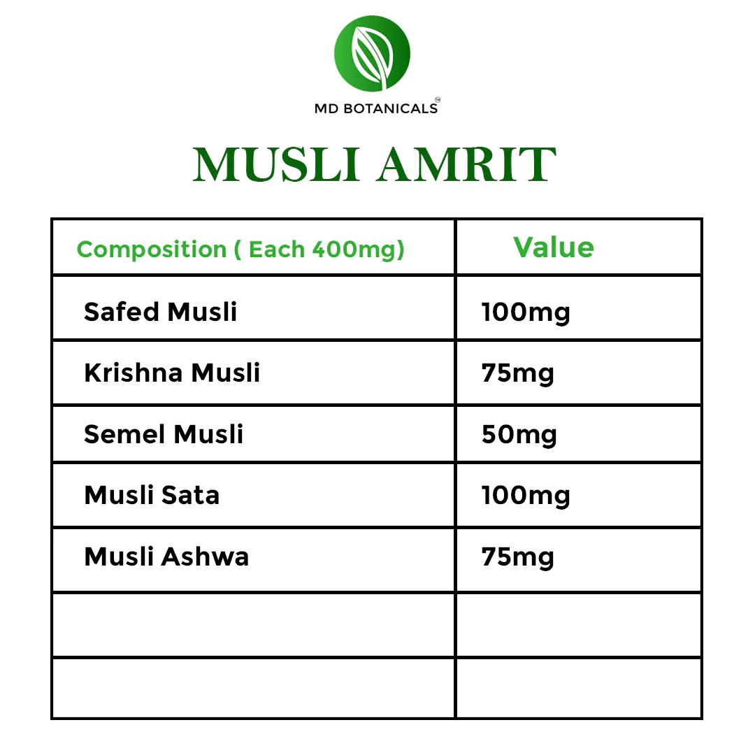 Musli Amrit Capsules are dietary supplements that contain extracts or powder derived from Safed Musli (Chlorophytum borivilianum), a herbaceous plant native to India. Safed Musli has been traditionally used in Ayurvedic medicine for its potential health benefits, particularly for enhancing vitality and improving sexual wellness. Here’s a general description of Musli Amrit Capsules: