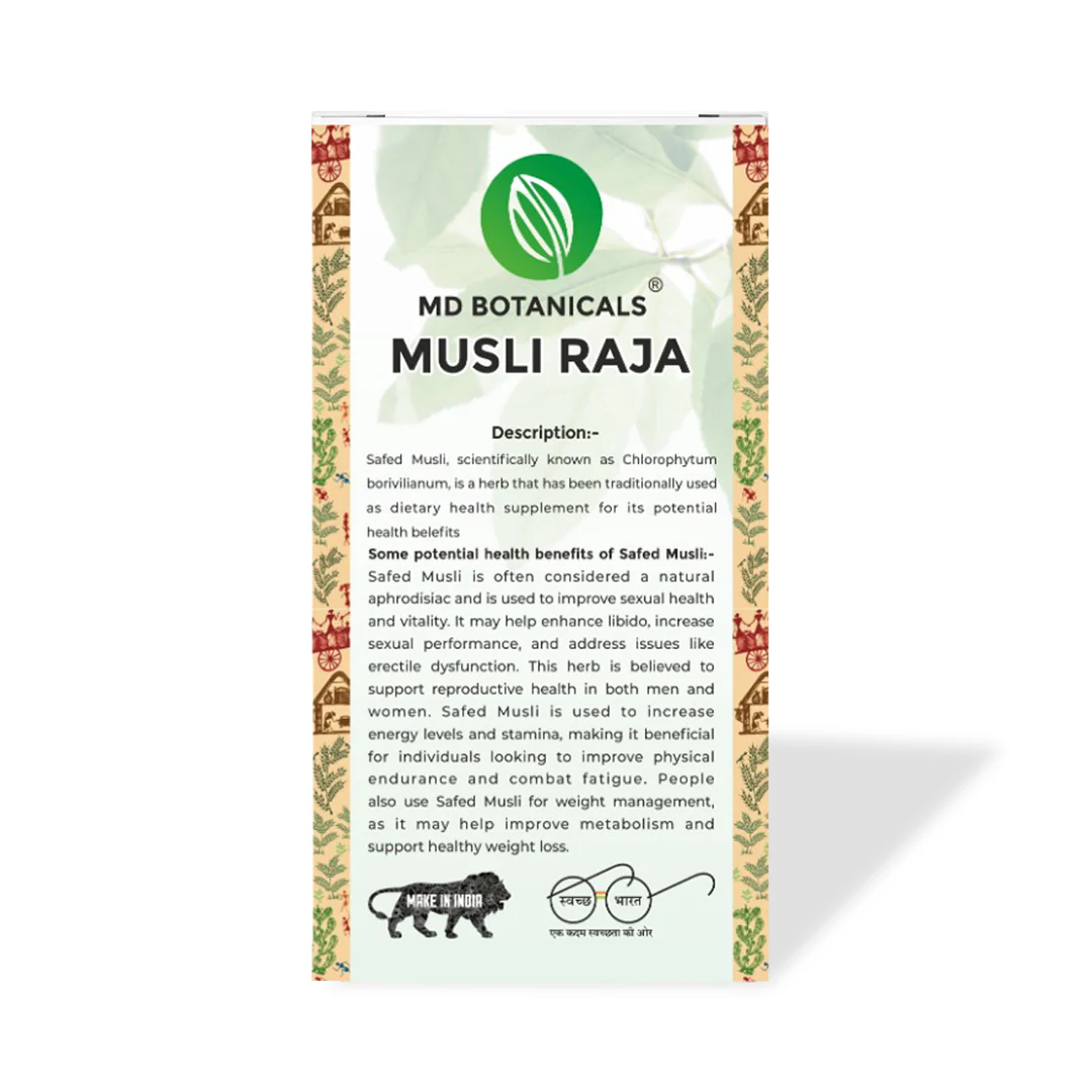 Musli capsules typically contain extracts or powder derived from Safed Musli (Chlorophytum borivilianum), a herbaceous plant native to India. Safed Musli has been used in traditional Ayurvedic medicine for its potential health benefits, particularly in enhancing vitality, stamina, and overall wellness. Here’s a general description of Musli capsules: