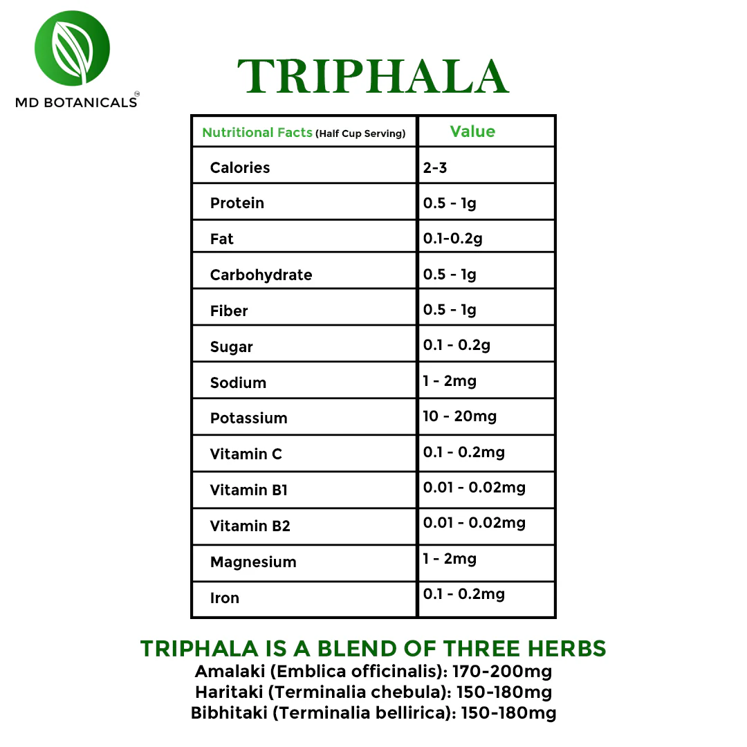 Triphala capsules contain a standardized blend of the three fruits: Amalaki (Emblica officinalis), Bibhitaki (Terminalia bellirica), and Haritaki (Terminalia chebula). These fruits are dried, powdered, and combined in specific proportions to create Triphala capsules.