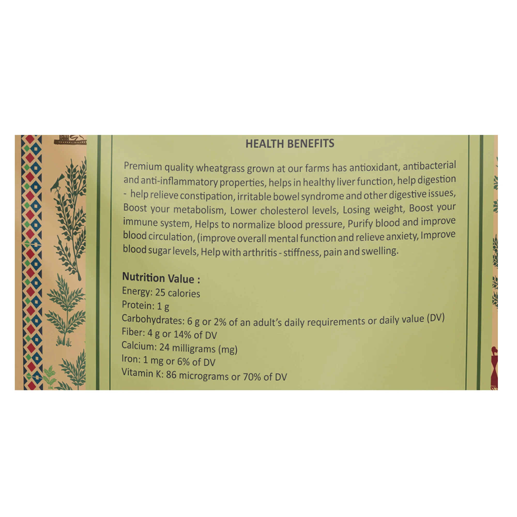 Premium quality wheatgrass grown at our farms has antioxidant, antibacterial, and anti inflammatory properties, Healthy liver function, help digestion – help relieve constipation, irritable bowel syndrome, and other digestive issues, Boost your metabolism, Lower cholesterol levels, Losing weight, Boost your immune system, Helps to normalize blood pressure, Purify blood and improve blood circulation, (improve overall mental function and relieve anxiety, Improve blood sugar levels, Help with arthritis – stiffness, pain, and swelling.